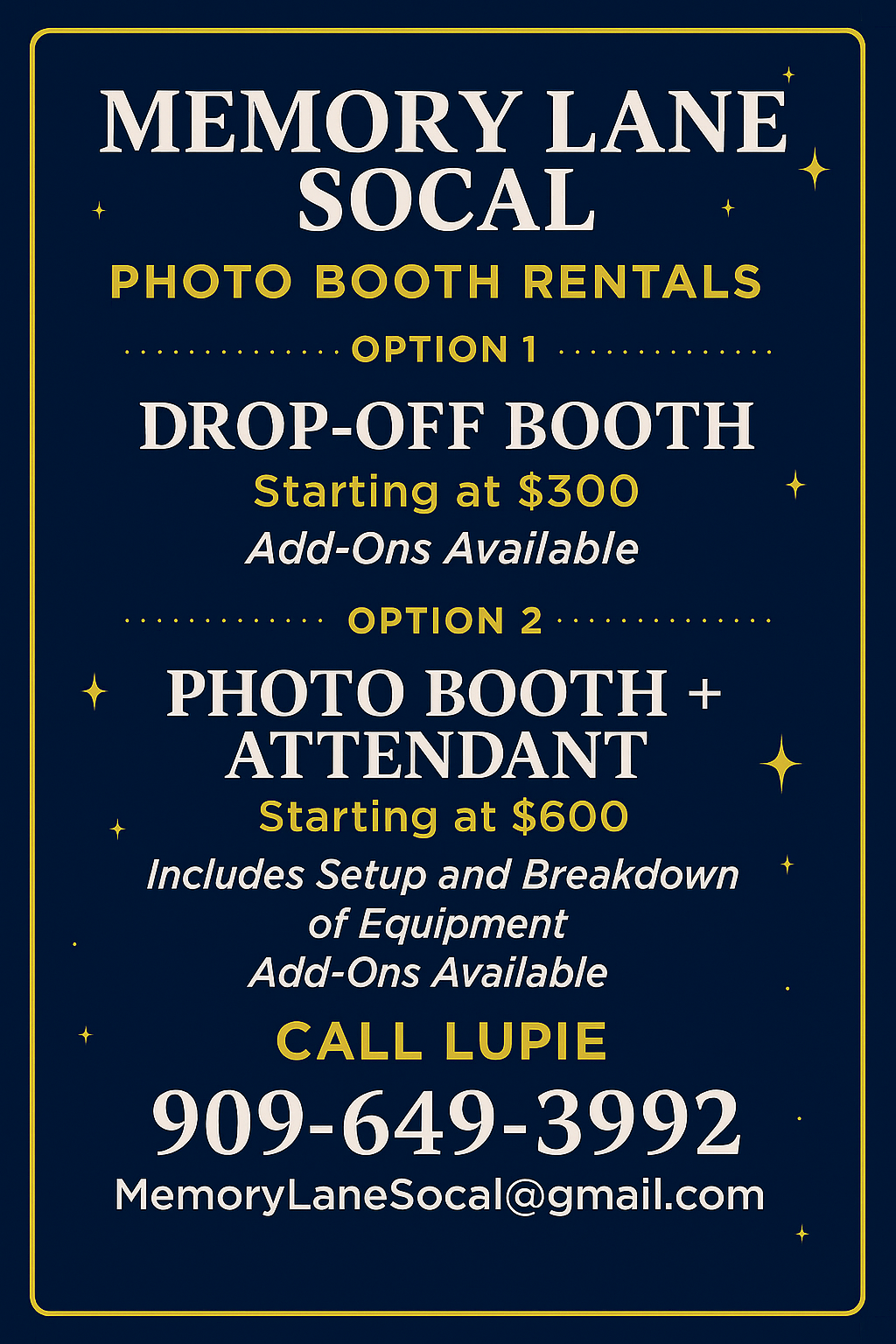 📩 Contact Us 🌐 www.MemoryLaneSoCal.com 📸 @MemoryLaneSoCal 📘 facebook.com/MemoryLaneSoCal ✉️ memorylanesocal@gmail.com 📞 (909) 649-3992